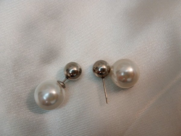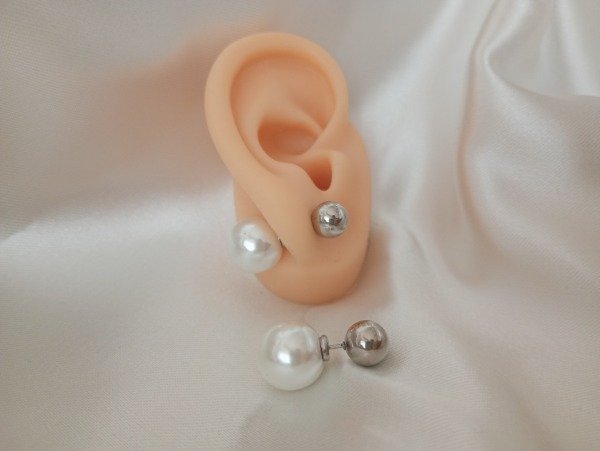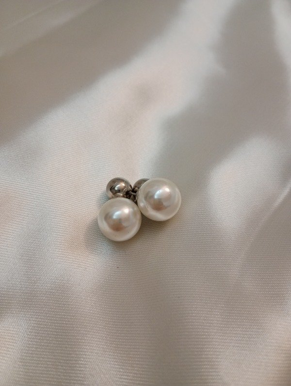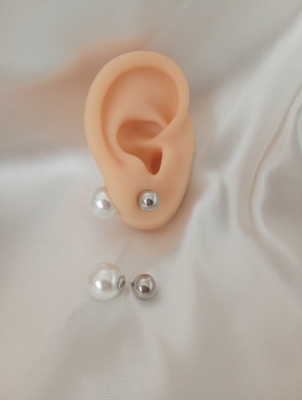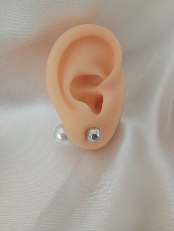 Aros pasantes de acero quirúrgico, tiene una bolita de acero quirúrgico de 0,7 cm y del otro lado una perla de 1,3 cm.