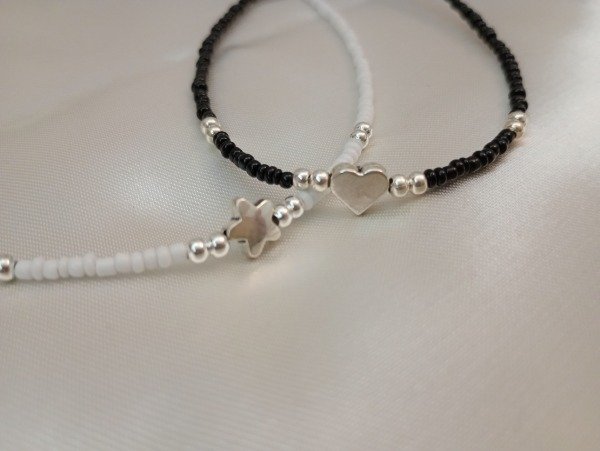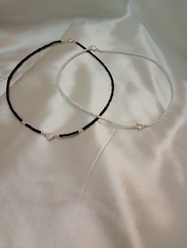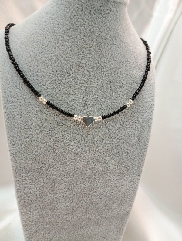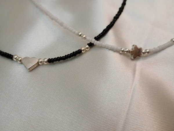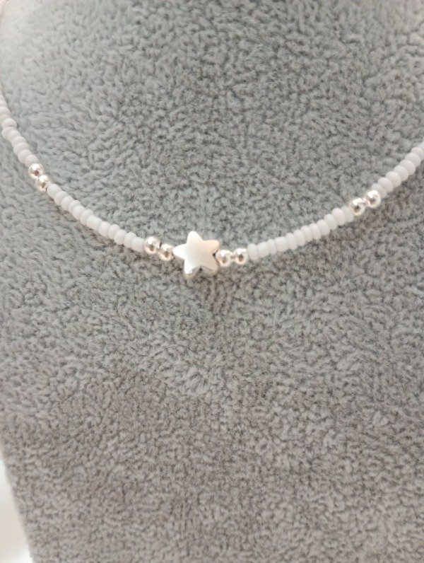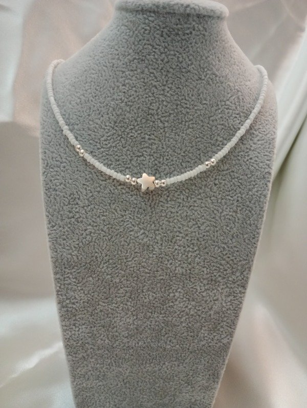 Collar de mostacillas y acero quirúrgico blanco, con dije central de formas. Tiene 40 CM de largo. Cierre mosquetón.