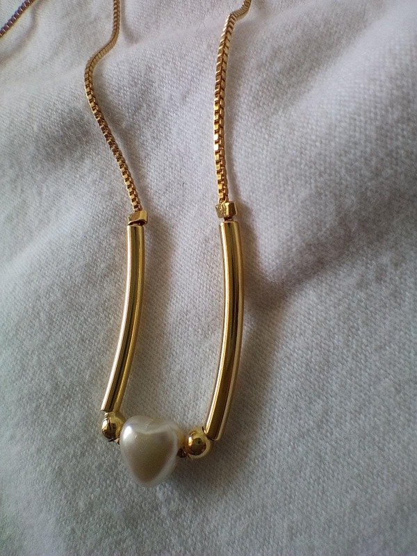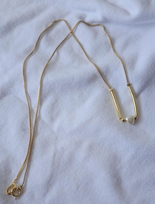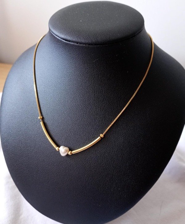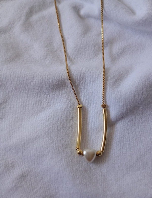 Conjunto de acero dorado, con perla central en forma de corazón y dos barritas de acero a los costados. Cadena fina de 45 cm de largo. Cierre mosquetón