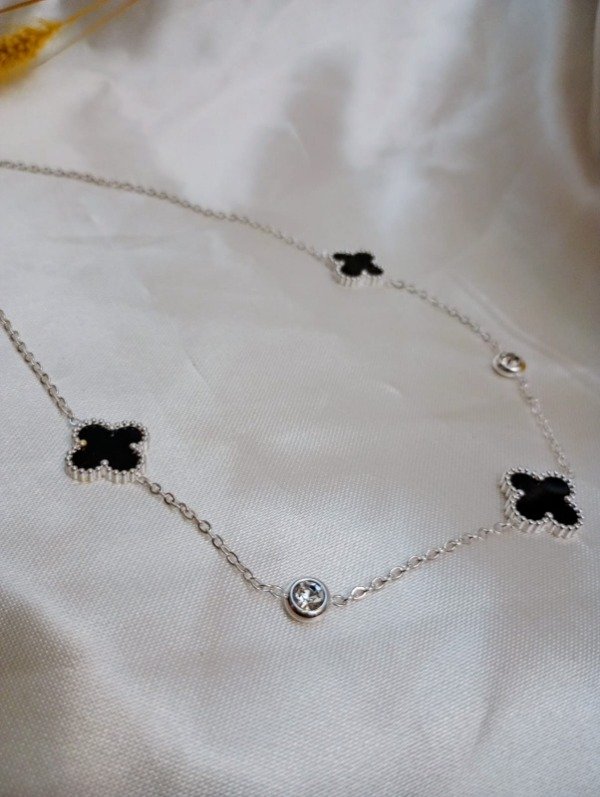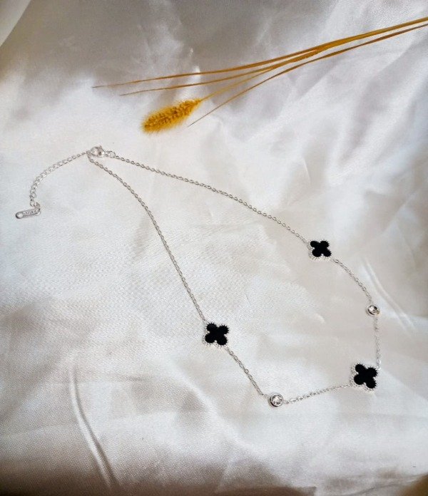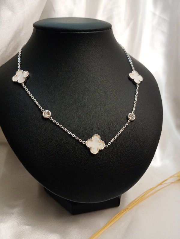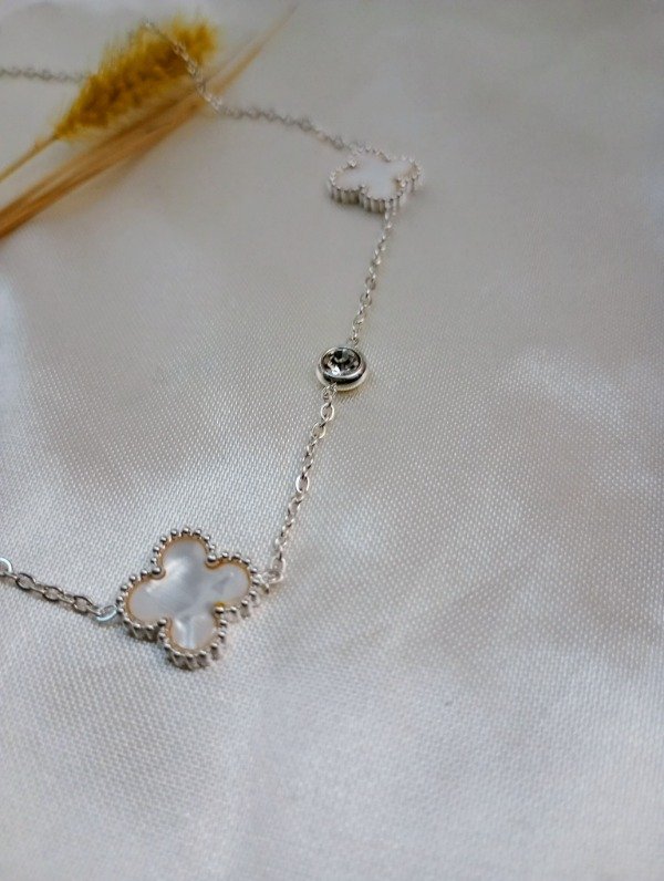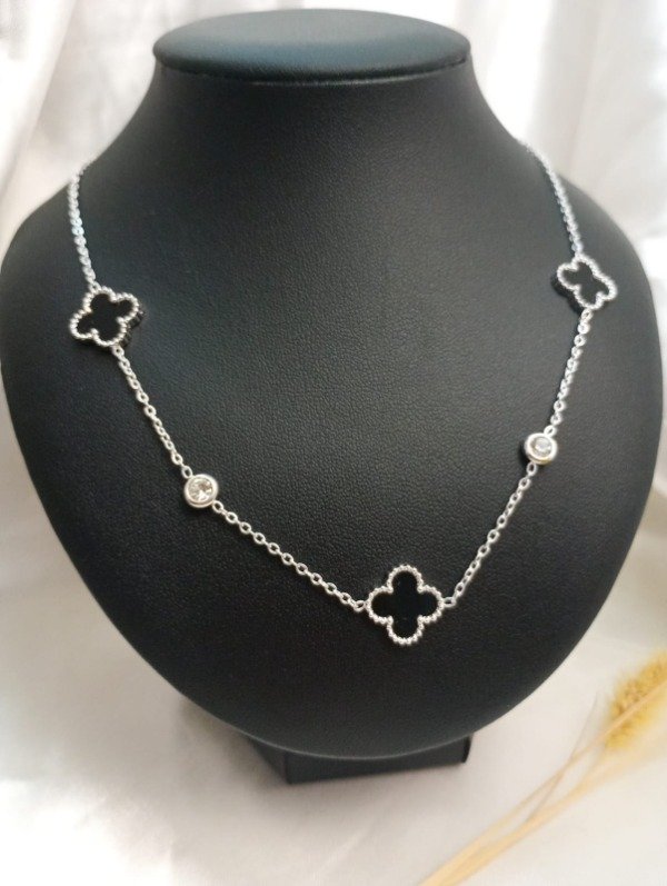 Cadena de acero blanco de 40 cm y 5 cm más de extensión. Tiene 3 dijes fijos tipo trébol y dos destellos punto de luz.