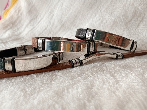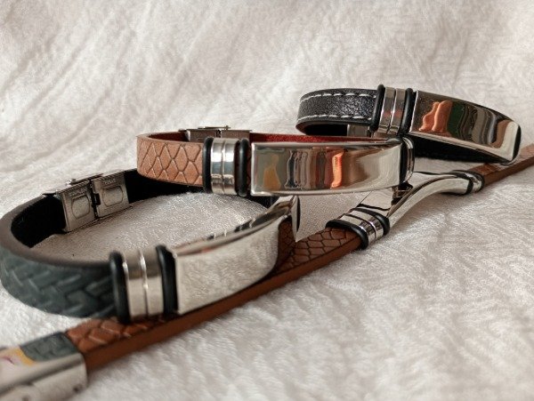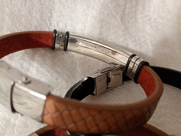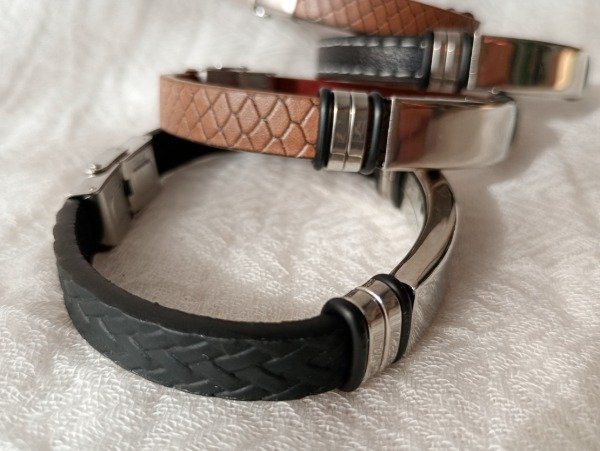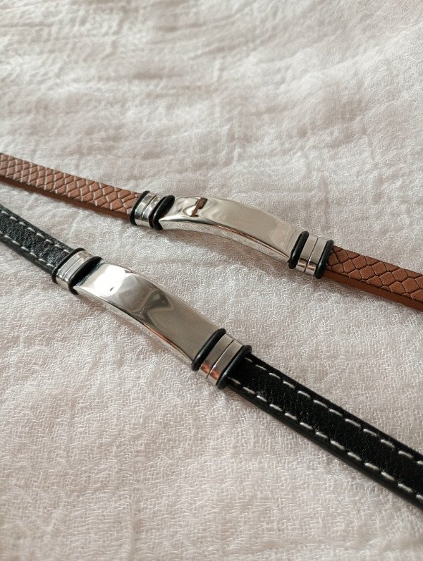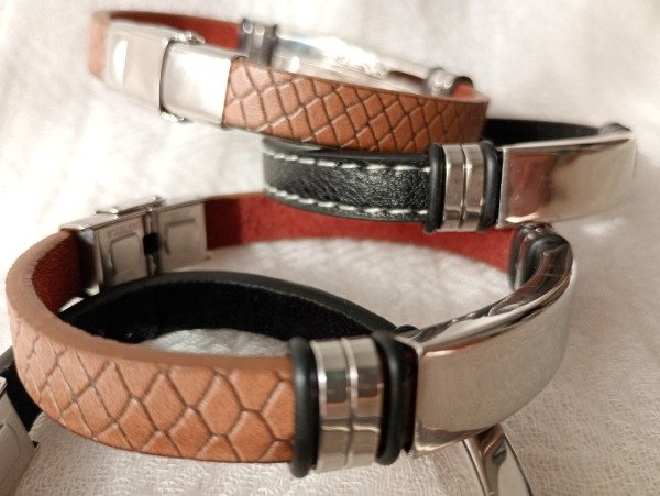 Pulsera de ecocuero y acero quirúrgico. Tiene 22 CM de largo.